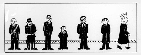 The following image is from Marjane Satrapi’s Persepolis (2000), the story of her upbringing in a turbulent and oppressive Iran. This book has received much acclaim and thorough analysis makes it easy to see why. She tells at once the story of her country, her neighborhood, her family, and her self. The style is sparse; she veers away entirely from ‘truthful’ visuals and manipulates the drawn elements to support the narrative as she sees fit. Panels are devoid of unnecessary details and contain only the key elements required, displaying only the occasional piece of background patterning. However even the patterns are an intrinsic part of the Iranian culture, and therefore a rudimentary aspect of the atmosphere she creates. Marjane weaves an engaging narrative and the basic visuals allow it to flow at speed. Her eye for composition and ability to balance the panels as an individual part as well as the meta-page make up for any shortcomings in drafting ability. Here we are reminded that there are two tracks, the visual track and the textual track, and they must work together in harmony at all times.