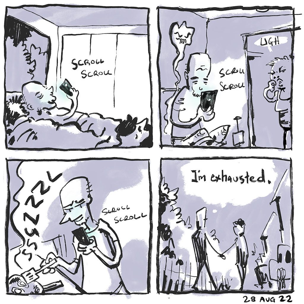 A short comic about how easy it is to slip into a habit of mindless zombie scrolling. Everywhere. Even the toilet. How did this happen to us all? When did we become absolute slaves to the screen and to distraction? It makes it harder to get into flow states. It keeps me away from drawing with paper and pen. I remember spending hours and hours as a kid drawing comics, totally in the zone. Sometimes I miss living in a world that actively works against making that possible.