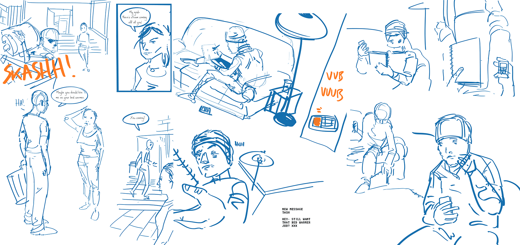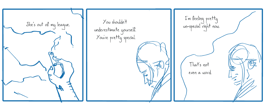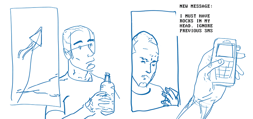 These couple of pages show a little of the character’s inability to play it cool. Texting, changing his mind, regretting, wanting, hurting… making bad choices… Read More »Digital Impatience
